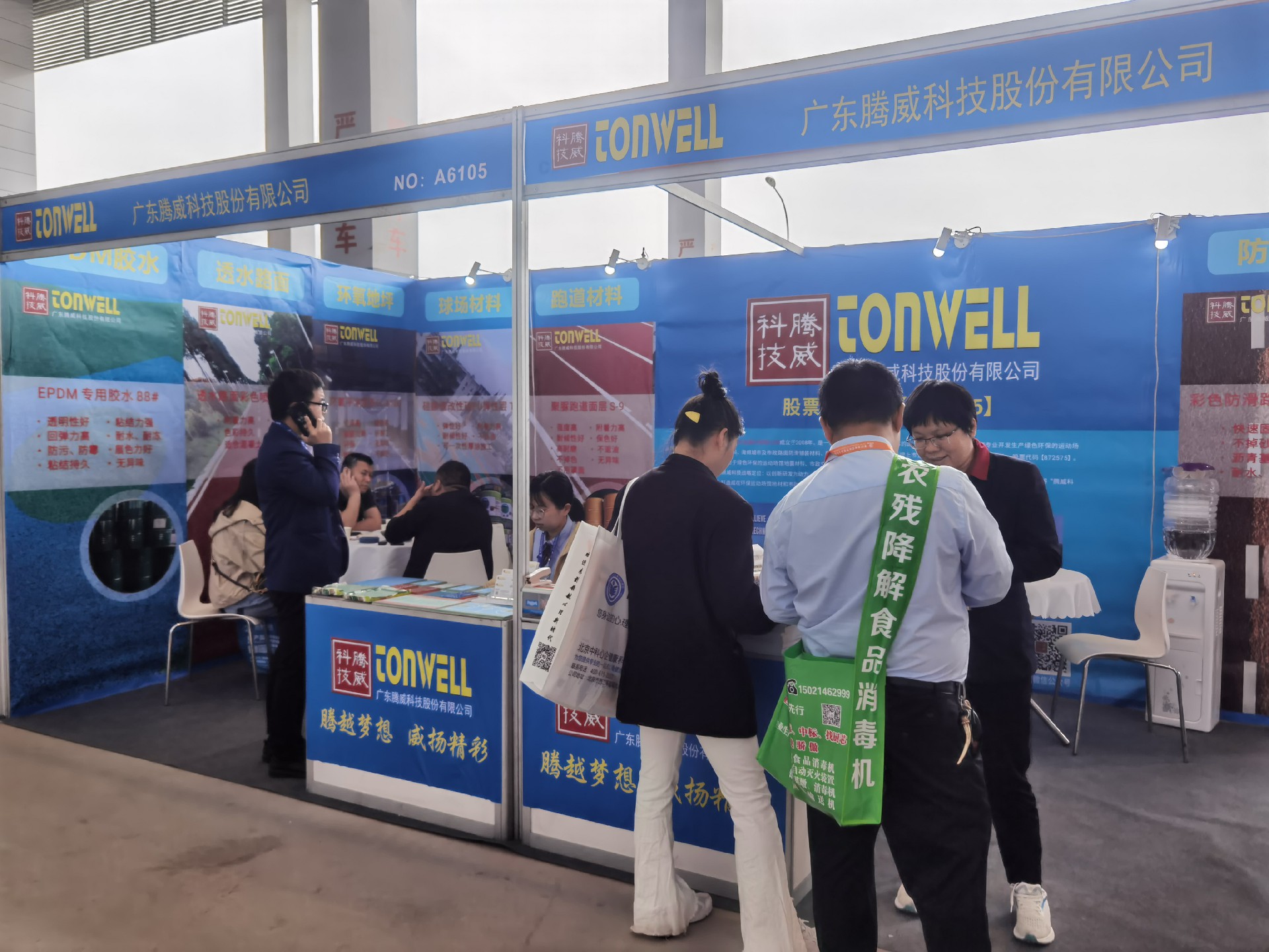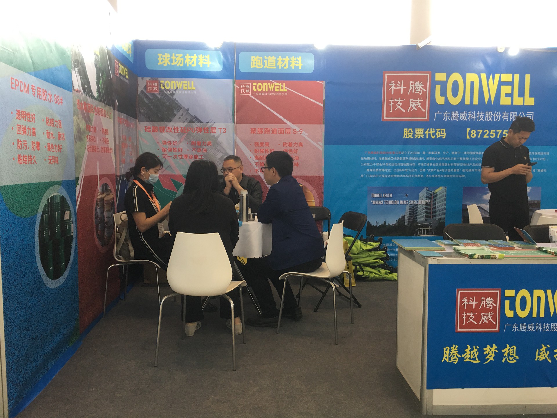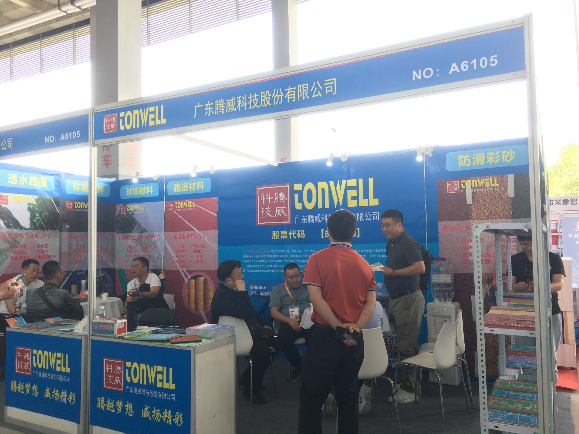 廣東騰威科技攜帶運(yùn)動(dòng)場(chǎng)館地面材料、市政彩色防滑路面、工商業(yè)地坪材料三大鋪裝體系產(chǎn)品亮相本次展會(huì)。展位現(xiàn)場(chǎng)絡(luò)繹不絕、談笑風(fēng)聲。
